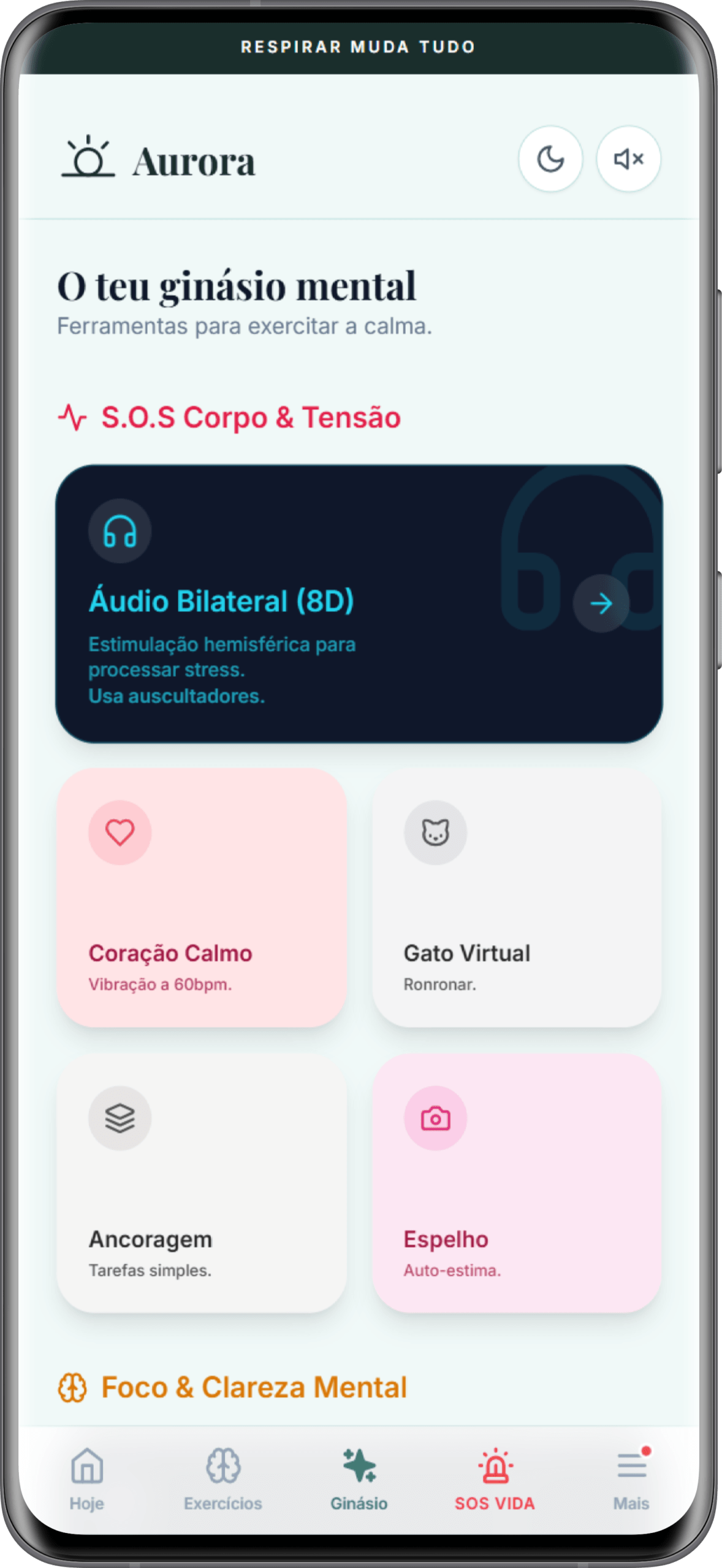 Através de som, vibração, movimento e interacção com o ecrã, a Aurora ajuda-te a descarregar tensão, acalmar o sistema nervoso e reorganizar estados de stress mais intensos. Estas ferramentas são especialmente úteis quando falar ou pensar não é suficiente.